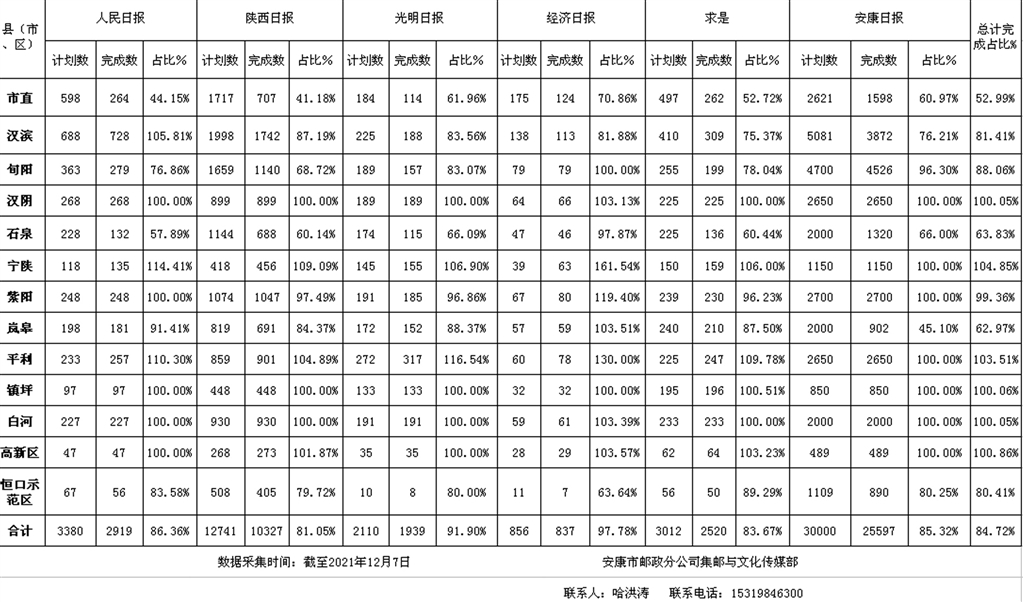 截至2021年12月7日,全市重點黨報黨刊完成量占下達計劃數(shù)的84.72%。征訂情況為:寧陜縣104.85%,平利縣103.51%,高新區(qū)100.86%,鎮(zhèn)坪縣100.06%,漢陰縣100.05%,白河縣100.05%,紫陽縣99.36%,旬陽市88.06%,漢濱區(qū)81.41%,恒口示范區(qū)80.41%,嵐皋縣62.97%,市直各單位52.99%。其中,寧陜縣、平利縣、高新區(qū)、鎮(zhèn)坪縣、漢陰縣、白河縣,措施有力,率先完成2022年度征訂任務。