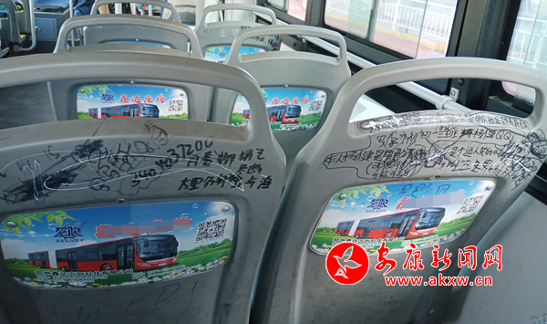 7月7日,筆者乘坐安康市城區(qū)7路公交車(chē)發(fā)現(xiàn),公交座椅靠背慘遭“涂鴉”,內(nèi)容不乏廣告標(biāo)語(yǔ)、低俗粗鄙、不堪入目的語(yǔ)言,嚴(yán)重影響乘車(chē)心情。希望廣大乘客文明乘車(chē),還市民一個(gè)干凈整潔的乘車(chē)環(huán)境。(通訊員 成忠旭)