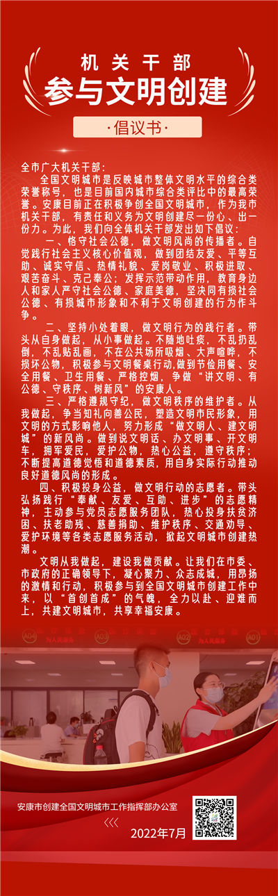 全國文明城市是反映城市整體文明水平的綜合類榮譽(yù)稱號,也是目前國內(nèi)城市綜合類評比中的最高榮譽(yù)。安康目前正在積極爭創(chuàng)全國文明城市,作為我市機(jī)關(guān)干部,有責(zé)任和義務(wù)為文明創(chuàng)建盡一份心、出一份力。為此,我們向全體機(jī)關(guān)干部發(fā)出如下倡議: