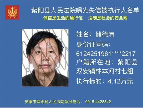 曝光失信 | 紫陽縣人民法院:關于敦促儲德清履行法定義務的公告