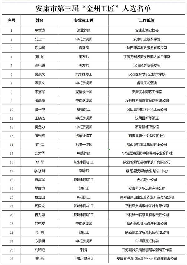 根據(jù)市委組織部、市總工會(huì)、市人社局《關(guān)于開(kāi)展第三屆“金州工匠”評(píng)選活動(dòng)的通知》(安人社函〔2022〕243號(hào))和《安康市“金州工匠”評(píng)定辦法》,經(jīng)申報(bào)、評(píng)審并征求有關(guān)部門意見(jiàn),擬評(píng)選安康市漁業(yè)協(xié)會(huì)單世濤等27人為安康市第三屆“金州工匠”,現(xiàn)予公示,公示期自2023年3月28日至2023年4月3日。
