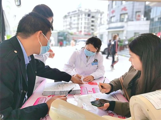 早上9點,列隊等候的醫(yī)務(wù)工作者們在獻血車前,井然有序的進行信息登記、健康征詢、血壓測量等程序。他們中有多次獻血的“老兵”,也有首次獻血的年輕職工,有的剛下夜班,有的趁工作間隙,還有的則放棄了休息趕來。大家紛紛表示,無償獻血就是以實際行動踐行廣大醫(yī)護人員的初心使命,為老百姓的生命健康保駕護航。
