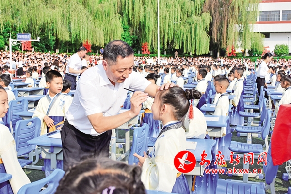 為傳承中國傳統(tǒng)文化,進(jìn)一步加強(qiáng)學(xué)生文明禮儀教育,日前,安康高新區(qū)第一小學(xué)舉行一年級(jí)新生開筆禮及優(yōu)秀學(xué)生表彰活動(dòng)。千名一年級(jí)蒙童身著漢服,由班主任帶領(lǐng)跨過啟蒙門,正衣冠、感恩鞠躬、朱砂啟智、擊鼓明志、開筆啟蒙,接受中國傳統(tǒng)文化的洗禮,領(lǐng)略傳統(tǒng)文化的魅力。(張凌云 攝)
