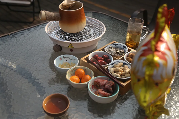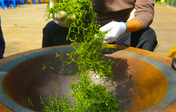 翠屏島瀛湖茶舍,我們推出了圍爐煮茶項目,炒茶師傅現(xiàn)場殺青、揉捻、干燥,隨后將瀛湖的明前茶呈送到游客面前。當(dāng)然,游客若有興趣,也可親自實操這難能可貴的體驗。