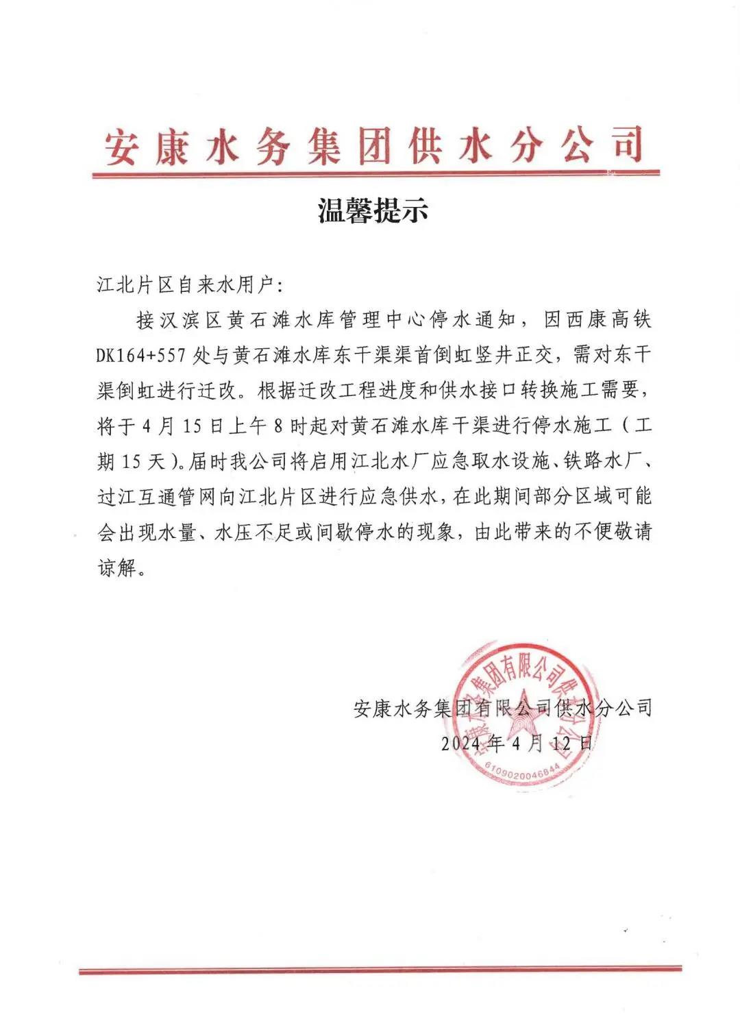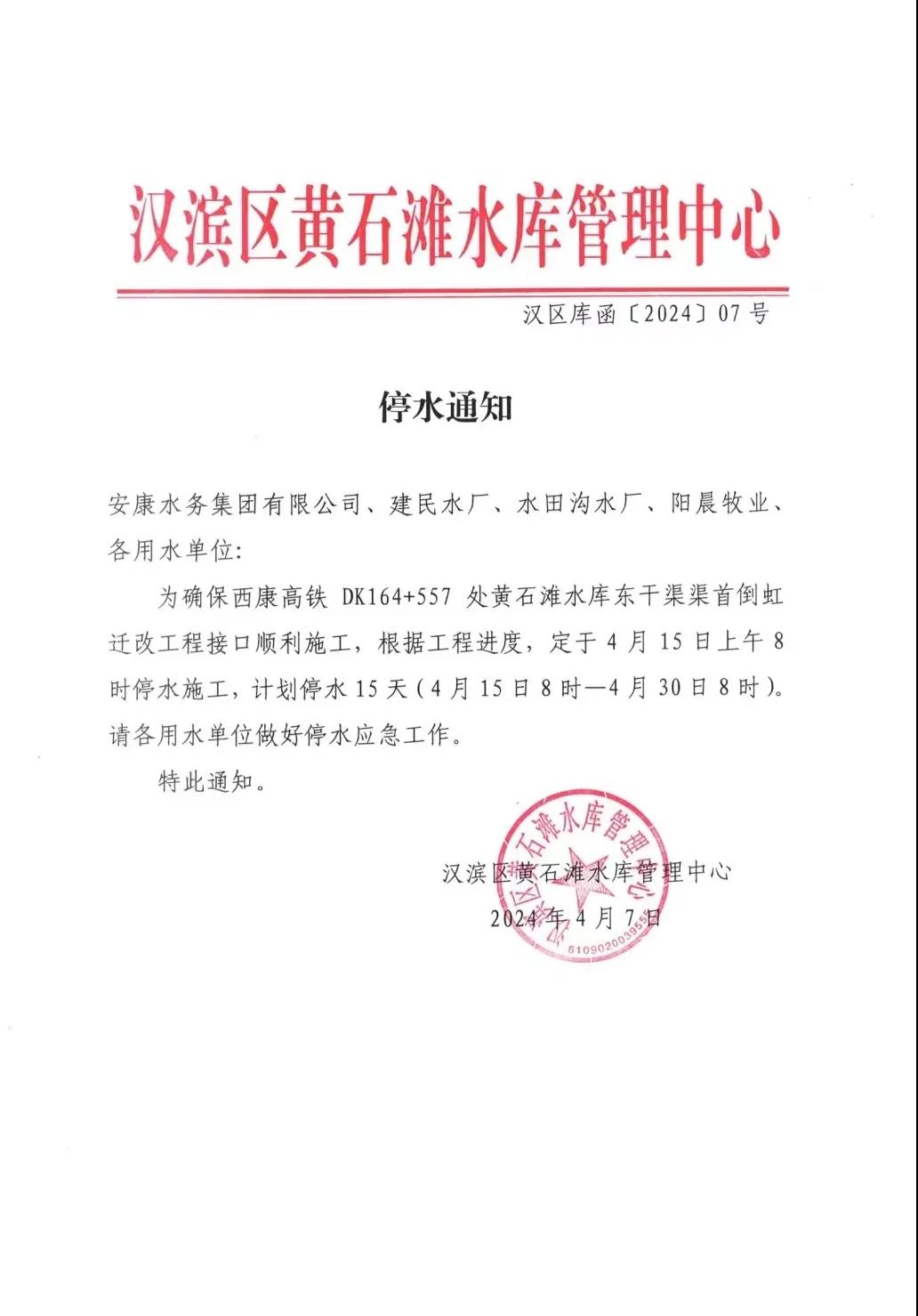 本網(wǎng)訊 4月12日,安康水務(wù)集團有限公司供水分公司發(fā)布停水通知:因西康高鐵DK164+557處與黃石灘水庫東干渠渠首倒虹豎井正交,需對東干渠倒虹進(jìn)行遷改。根據(jù)遷改工程進(jìn)度和供水接口轉(zhuǎn)換施工需要,將于4月15日上午8時起對黃石灘水庫干渠進(jìn)行停水施工(工期15天)。
