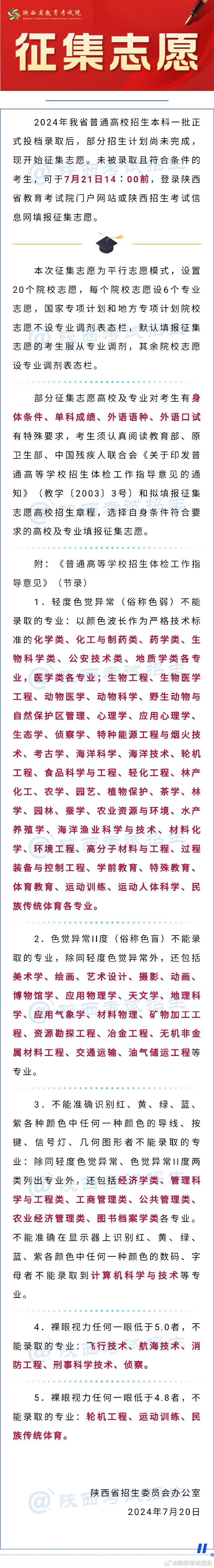 2024年我省普通高校招生本科一批正式投檔錄取后,部分招生計劃尚未完成,現(xiàn)開始征集志愿。未被錄取且符合條件的考生,可于7月21日14∶00前,登錄陜西省教育考試院門戶網(wǎng)站或陜西招生考試信息網(wǎng)填報征集志愿。