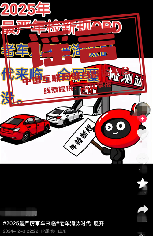 真相:近日,多個(gè)自媒體賬號(hào)發(fā)布消息,宣稱(chēng)“史上最嚴(yán)車(chē)檢來(lái)了”“車(chē)檢年限變化”“燃油車(chē)年檢增加OBD檢測(cè)”等。中央廣電總臺(tái)中國(guó)之聲記者多方求證了解到,上述說(shuō)法均為不實(shí)消息,目前各地車(chē)檢并沒(méi)有新變化。
