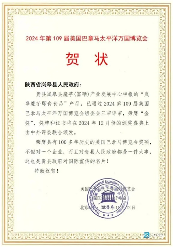 1月8日,筆者從泰國曼谷舉行的2024年第109屆美國巴拿馬太平洋萬國博覽會(huì)頒獎(jiǎng)盛典上獲悉,由嵐皋縣魔芋產(chǎn)業(yè)發(fā)展中心申報(bào)的“嵐皋魔芋即食食品”,榮膺2024年第109屆美國巴拿馬太平洋萬國博覽會(huì)“金獎(jiǎng)”。