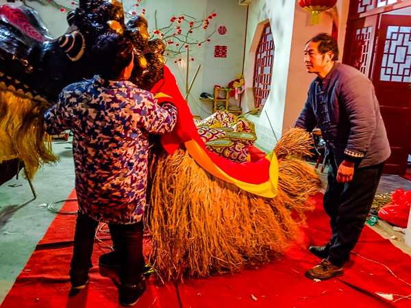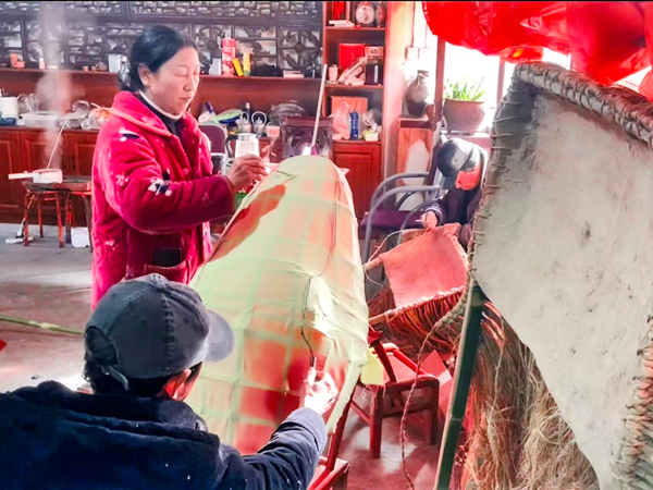 “龍頭是整條龍的重點(diǎn),刻畫要逼真,色彩還得鮮艷。忙碌了一年的鄉(xiāng)親們,就希望在正月里,抖擻精神,舞動(dòng)起來。”說話間,李忠寶一雙巧手上下翻飛,正在修剪龍頭花燈的胡須,忙得額頭沁出了汗珠。兒子李石磊則忙著幫烤、粘、填、糊、上色……在他們父子倆的精雕細(xì)琢下,一個(gè)威風(fēng)凜凜、栩栩如生的花燈道具龍頭,總算扎制完成。