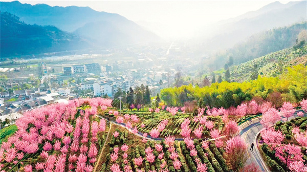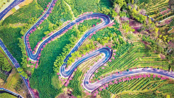 沿著茶山步道拾級而上,茶農(nóng)采青的竹簍與游人拍照的紗巾在梯田間次第閃現(xiàn)。粉白相間的梅花如云絮般綴滿枝頭,風(fēng)過處,花瓣簌簌落入茶叢,為嫩綠的新芽染上淡淡馨香。遠(yuǎn)處黛瓦白墻的徽派民居與近處起伏的茶壟構(gòu)成天然畫框,無人機視角下,蜿蜒的茶道如同玉帶纏繞山腰,將紅楓、櫻花、梅林串成斑斕的珠鏈。