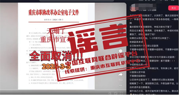 真相:近日,有網民在互聯網平臺發(fā)布消息稱“重慶市宣布,申請評審的要求取消了很多條條框框,職稱申請不看前置職稱,全日制本科十年直接認定副高,不需要中級職稱”,引發(fā)關注。經核實,網傳信息系謠言。職稱評審均需逐級晉升,取得上一級職稱并滿足相應學歷資歷條件后方可晉升高一級職稱。目前重慶市除特殊人才、博士后等3個針對特定對象的職稱申報綠色通道外,正常申報通道均需逐級晉升。網傳文件是網民通過P圖軟件編輯而成,試圖吸引不明真相的群眾咨詢,借機推銷職稱代辦服務,收取高額費用。目前,謠言線索已轉交公安機關進一步調查處置。(來源:“重慶辟謠”微信公眾號)