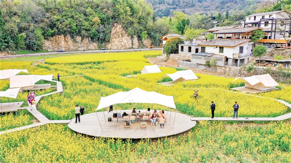 陽春三月,秦嶺腳下,春風(fēng)彌漫,油菜花開得正旺,朱鹮掠過古村青瓦。白墻黛瓦的民宿群中,咖啡濃香與油菜花香交織,令游人流連忘返,返鄉(xiāng)青年正在直播推介農(nóng)貨……