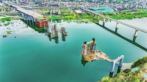 橋梁上部結構開始施工 安康新關廟漢江大橋“破水而出”