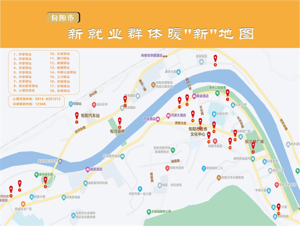 為提升服務(wù)效能,讓更多新就業(yè)群體享受到便捷的暖新服務(wù),旬陽市委社會工作部特別制作了暖“新”地圖,將城區(qū)18處共享驛站具體位置精準(zhǔn)標(biāo)注在地圖上,可一目了然找到距離最近的驛站。此外,暖“新”地圖還提供了旬陽心理咨詢熱線和“12348”法律援助熱線,全方位服務(wù)新就業(yè)群體。?