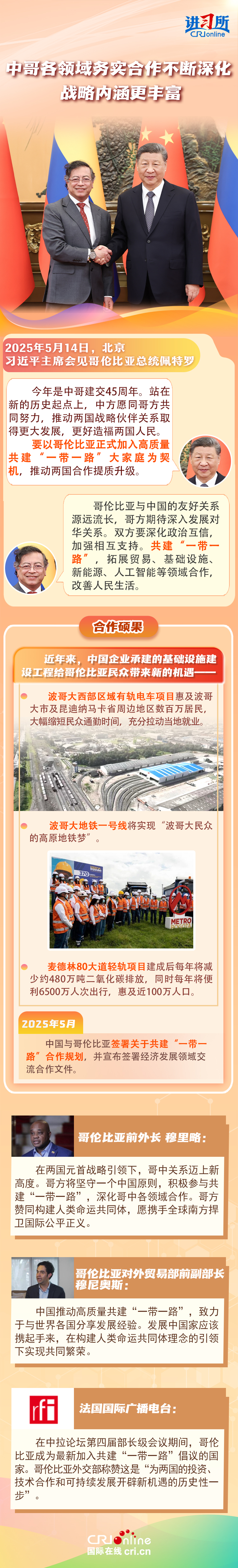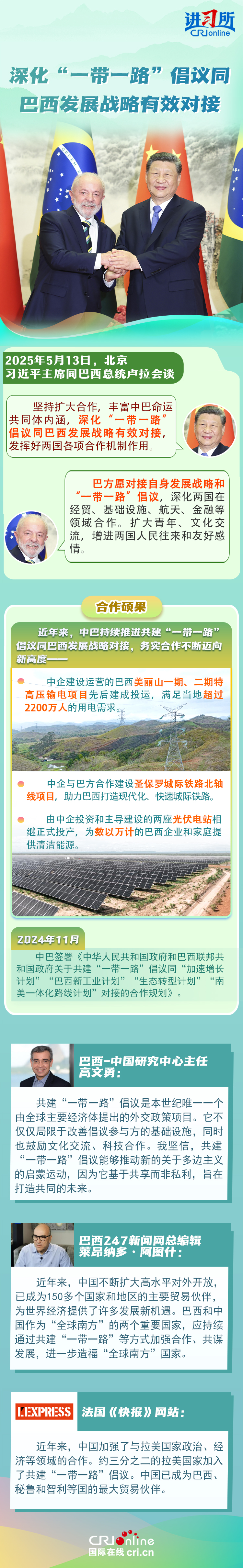 習近平主席在這三場雙邊外事活動中,均提到了共建“一帶一路”倡議:“深化‘一帶一路’倡議同巴西發(fā)展戰(zhàn)略有效對接”“要以哥倫比亞正式加入高質(zhì)量共建‘一帶一路’大家庭為契機,推動兩國合作提質(zhì)升級”“雙方要落實好共建‘一帶一路’合作規(guī)劃”……10多年來,在習近平主席親自擘畫和推動下,共建“一帶一路”從中國倡議走向國際實踐,取得了實打實、沉甸甸的成就。