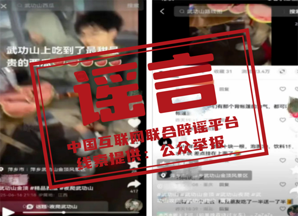 真相:近日,有網民在短視頻平臺發(fā)布“江西萍鄉(xiāng)武功山景區(qū)存在‘一錘子買賣’‘天價西瓜’”的視頻,引發(fā)社會關注。經查,視頻中 “賣西瓜” 的男子實為旅行社組織的武功山景區(qū)游客,途中接受視頻發(fā)布者邀請參與拍攝了一段“賣西瓜”的視頻。該西瓜系旅行社同行人員所帶,并非如視頻所說在景區(qū)內購買,景區(qū)也不存在網傳的“18元泡面”、“240元西瓜”等情況。目前,公安機關已對造謠者作出行政拘留十日的行政處罰。(來源:“公安部網安局”微信公眾號、“江西網警”微信公眾號)