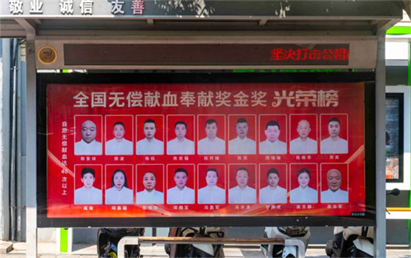 在第22個世界獻血者日到來之際,安康市中心血站精心策劃,自6月中旬起,在位于市政務(wù)大廳、市中心醫(yī)院、市中心醫(yī)院北院區(qū)門前的三處公交候車亭,以及中心城區(qū)兩處LED大屏上,全天循環(huán)展播著安康市榮獲“全國無償獻血奉獻獎”終身榮譽獎、金獎、銀獎、銅獎的獲獎?wù)叽盹L(fēng)采照片。