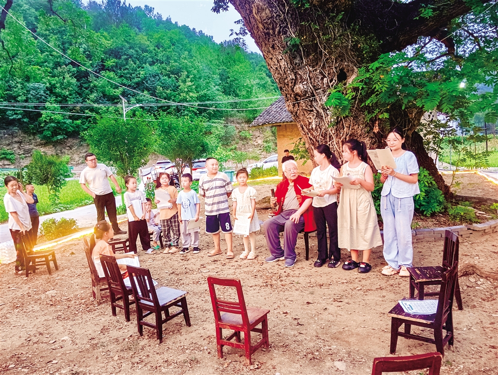 韓海燕(右四)在西河鎮(zhèn)磨溝村的古樹下給孩子們傳授國學(xué)知識