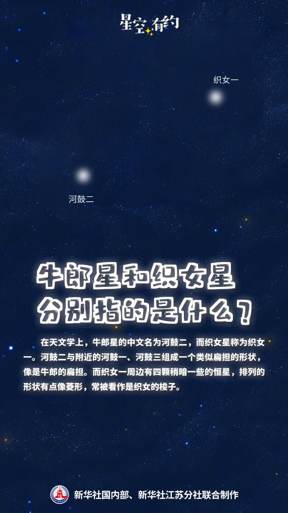 中國(guó)科學(xué)院紫金山天文臺(tái)科普主管王科超說(shuō),在天文學(xué)上,代表牛郎、織女的天體分別是牛郎星和織女星。牛郎星的中文名為河鼓二,織女星為織女一,它們分別是天鷹座和天琴座的亮星。河鼓二與附近的河鼓一、河鼓三組成一個(gè)類(lèi)似扁擔(dān)的形狀,像是牛郎的扁擔(dān)。而織女一周邊有四顆稍暗一些的恒星,排列的形狀有點(diǎn)像菱形,常被看作是織女的梭子。