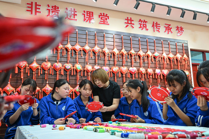 2025年9月26日,內(nèi)蒙古興安盟科右中旗巴彥呼舒第六中學(xué)美術(shù)教師、非遺代表性傳承人吳斯琴(左四)指導(dǎo)學(xué)生刺繡。近年來(lái),內(nèi)蒙古興安盟科爾沁右翼中旗巴彥呼舒第六中學(xué)將當(dāng)?shù)貒?guó)家級(jí)非遺圖什業(yè)圖刺繡引入校園,開設(shè)校本課程,并成立興趣社團(tuán),在豐富校園文化生活的同時(shí),讓學(xué)生們近距離感受非遺的魅力,弘揚(yáng)和傳承中華優(yōu)秀傳統(tǒng)文化。