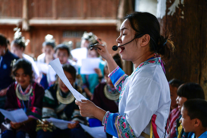 隨著國(guó)產(chǎn)動(dòng)畫電影《哪吒之魔童鬧?!凡粩嗨⑿轮袊?guó)影史票房紀(jì)錄,參與電影配樂的貴州省榕江縣三寶侗寨的楊想妮和“舞樂蟬歌”團(tuán)隊(duì)為更多人所熟知。樂團(tuán)成員懷揣“用音樂傳遞侗族文化,讓世界聽見侗族大歌”的共同夢(mèng)想,將侗族大歌推向更廣闊的舞臺(tái)。這是2025年4月22日,楊想妮在貴州省黎平縣肇興鎮(zhèn)廈格侗寨教前來(lái)研學(xué)的孩子們唱侗歌。