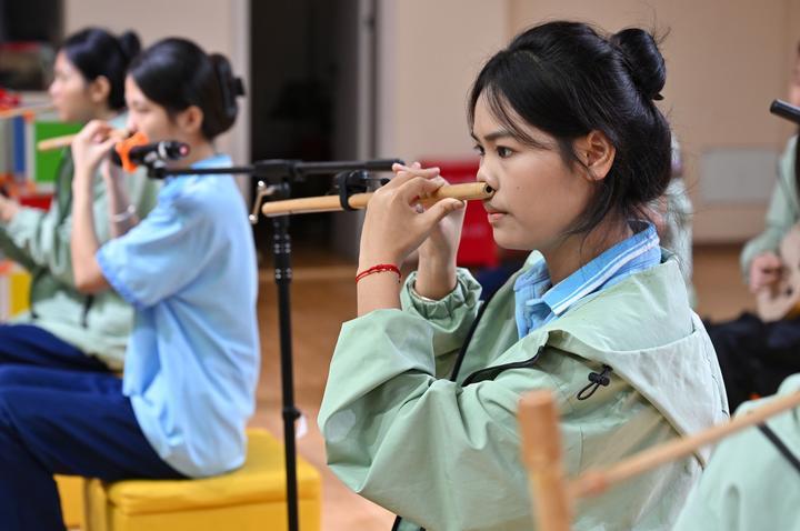 2025年6月12日,海南省民族技工學(xué)校學(xué)生在練習(xí)黎族鼻簫。近年來(lái),海南省五指山市打造“非遺進(jìn)校園”工程,在14所公辦中小學(xué)開設(shè)非遺課程,培養(yǎng)青少年對(duì)中華優(yōu)秀傳統(tǒng)文化的熱愛,助力非遺傳承與發(fā)展。