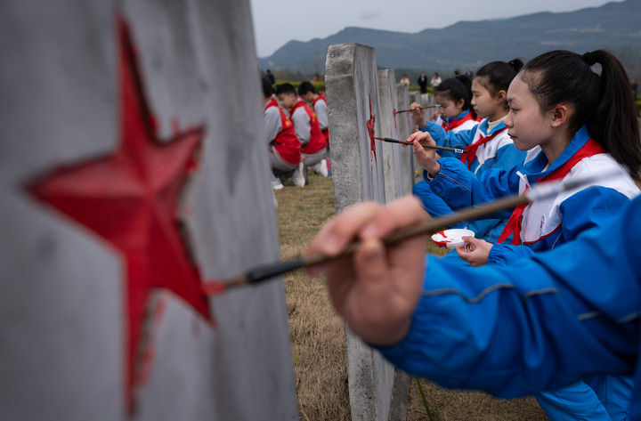 2025年3月31日,在四川川陜革命根據(jù)地紅軍烈士陵園,紅軍小學(xué)學(xué)生為無(wú)名烈士墓碑上的五角星描紅。當(dāng)日,來(lái)自四川通江縣的300名中小學(xué)青少年代表,齊聚川陜革命根據(jù)地紅軍烈士陵園,在莊嚴(yán)肅穆的儀式中開啟了一堂“紀(jì)念碑下的思政課”,為埋葬在這里的25048名紅軍烈士寄去哀思。