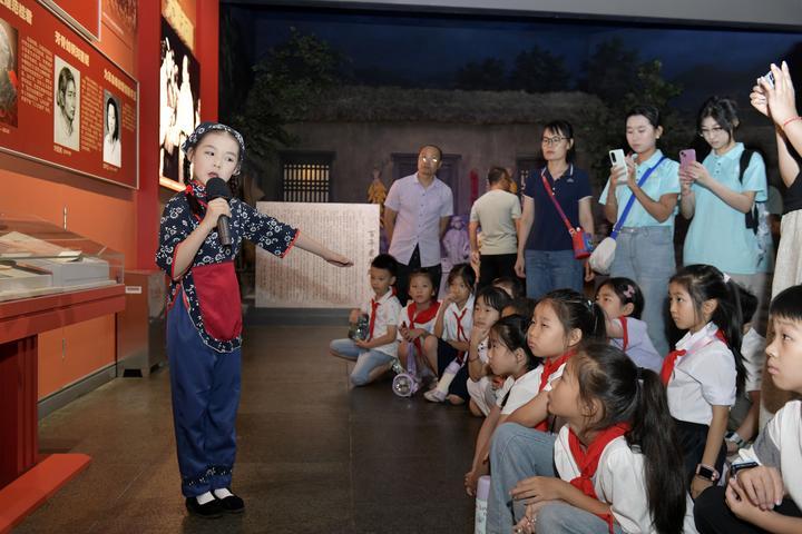 2025年8月7日,在山東省臨沂市沂蒙革命紀(jì)念館,沂蒙紅孩子文藝先鋒隊(duì)的房沫昕在講述紅色故事《沂蒙紅嫂祖秀蓮》。2024年9月,位于沂蒙革命老區(qū)的山東省臨沂市以“傳承沂蒙精神”為宗旨組建沂蒙紅孩子文藝先鋒隊(duì),通過歌舞、朗誦、故事講述、舞臺(tái)劇等紅色主題文藝節(jié)目,增強(qiáng)紅色文化感染力,不斷為紅色基因代代相傳注入新生力量。