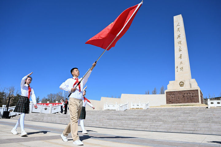 ? 這是2025年4月2日在內(nèi)蒙古呼和浩特市大青山紅色文化公園拍攝的中國(guó)少年先鋒隊(duì)出旗儀式。