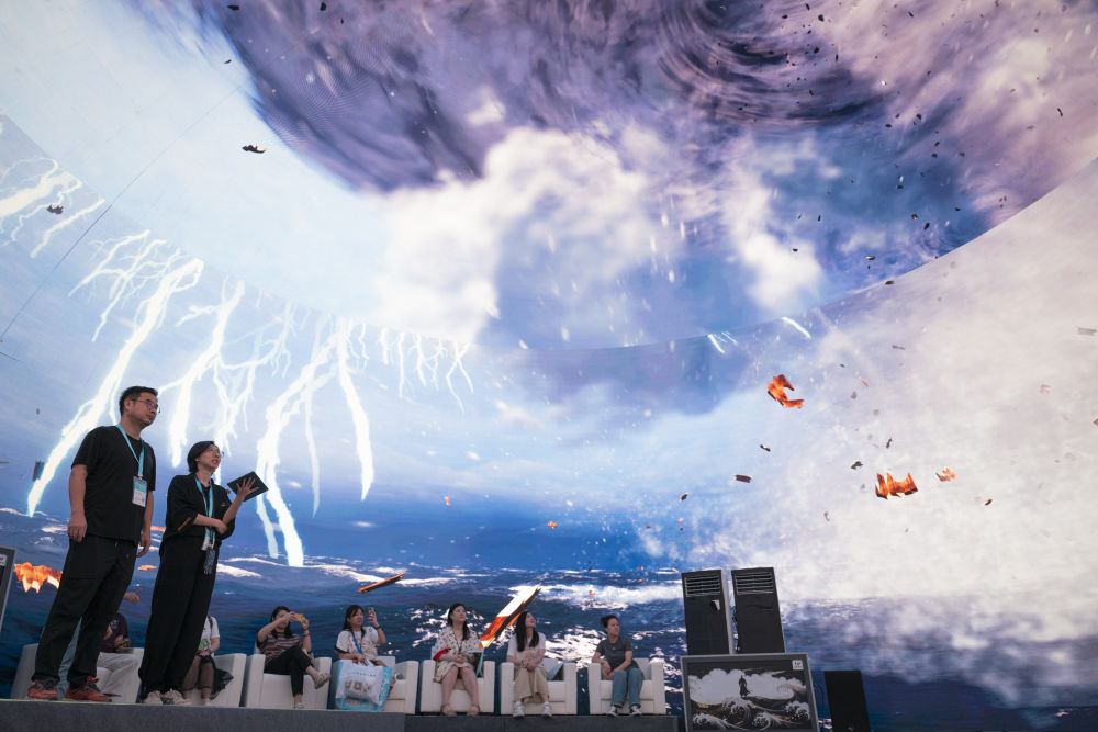 2024年7月22日,游客在“尋境敦煌——數(shù)字敦煌沉浸展”借助VR設(shè)備沉浸式游覽莫高窟第285窟虛擬場(chǎng)景?!皩ぞ扯鼗汀獢?shù)字敦煌沉浸展”綜合運(yùn)用VR虛擬現(xiàn)實(shí)、三維建模、游戲引擎的物理渲染和全局動(dòng)態(tài)光照等新技術(shù),高精度立體還原了莫高窟第285窟。游客戴上VR眼鏡,不僅可以零距離觀賞壁畫、360度自由探索洞窟細(xì)節(jié),還能“飛升”到窟頂,身臨其境參與壁畫故事情節(jié),沉浸式感受敦煌文化的魅力。
