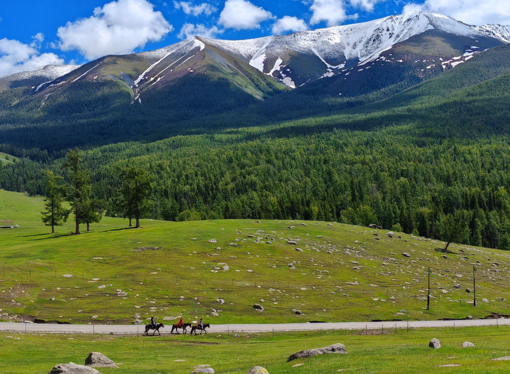 2024年6月4日,游客在新疆阿勒泰地區(qū)哈巴河縣騎馬游玩。電視劇《我的阿勒泰》播出后,新疆阿勒泰地區(qū)迎來客流高峰,“張鳳俠的小賣部”“巴太樹”“彩虹布拉克”等劇中地點(diǎn)成為熱門旅游打卡地。這場(chǎng)“邊城”與“熱劇”雙向奔赴的文旅盛宴,為當(dāng)?shù)亟?jīng)濟(jì)發(fā)展帶來新的增長點(diǎn)。2024年5月,當(dāng)?shù)亟哟慰?15.03萬人次,同比增長60.81%;實(shí)現(xiàn)旅游收入36.53億元,同比增長88.25%。