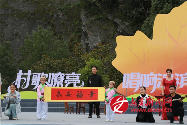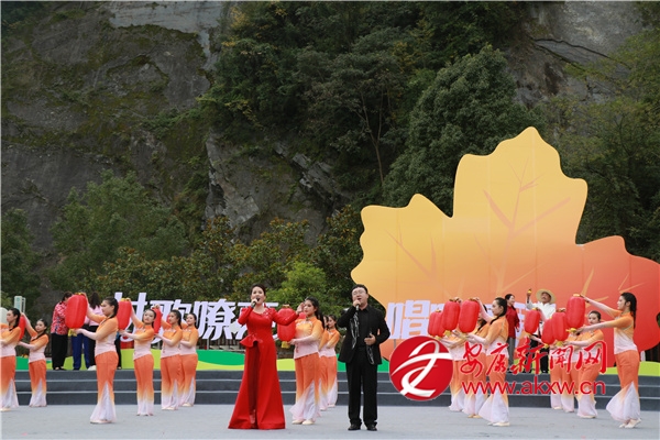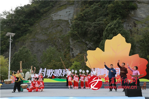 金秋時節(jié)的茨溝鎮(zhèn),萬畝紅葉、層林盡染。伴隨著歡快的鑼鼓聲,茨溝鎮(zhèn)、五里鎮(zhèn)、譚壩鎮(zhèn)三支隊伍輪番登場,不僅獻唱原創(chuàng)村歌,還展示特色產(chǎn)業(yè)、優(yōu)質(zhì)資源與地方文化,紛紛亮出獨具特色的“看家絕活兒”。歌伴舞《村歌飛揚》《松壩謠》《幸福歌兒唱起來》唱出了鄉(xiāng)親們的幸福生活;以修建八一水庫為背景的安康歌謠《我來了》引發(fā)會場共鳴;民俗表演《龍的傳人》則將節(jié)目推向高潮。舞蹈、鄉(xiāng)村T臺秀、民俗表演、八岔戲等節(jié)目,或以傳統(tǒng)幽默詼諧的風格,或以深情敘述的方式,展現(xiàn)鄉(xiāng)村新生活,為觀眾獻上一場別開生面的視聽盛宴,現(xiàn)場歡呼聲此起彼伏。