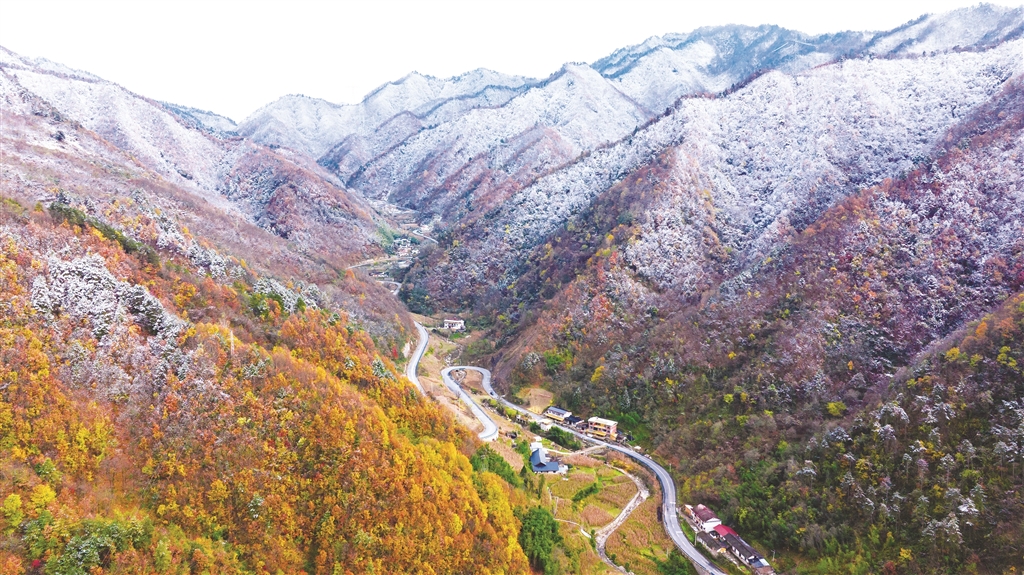 車子繼續(xù)向前,離寧陜?cè)絹?lái)越近時(shí),車窗外那片銀裝素裹的童話世界竟悄悄退場(chǎng),再次將五彩斑斕鋪展開來(lái)。楓紅未減,葉黃依舊,深綠的枝葉間還凝著點(diǎn)點(diǎn)雪色,像是剛從時(shí)光隧道走出一般。陽(yáng)光不知何時(shí)鉆出了云層,照在未化的雪上,泛起細(xì)碎的晶瑩。這時(shí)的山野,既有秋的飽滿,又有冬的清澈,仿佛一場(chǎng)盛大的交接正在無(wú)聲進(jìn)行,秋不忍盡褪其色,冬亦不忍驟掩其華,于是二者相融,成就了這短暫而珍貴的相遇。