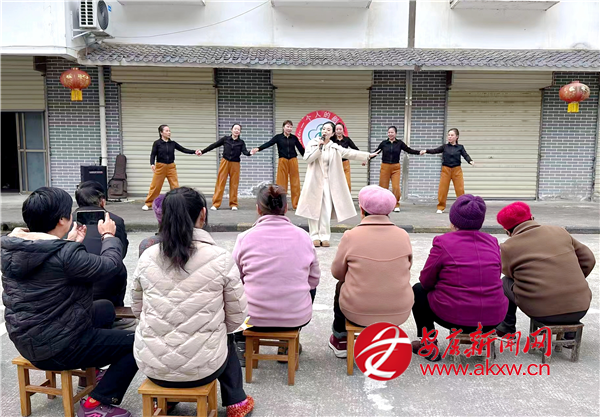 首場活動在城關鎮(zhèn)湯坪社區(qū)拉開帷幕。上午9點,演出團隊的小巴剛開進社區(qū)院子,志愿者們就迅速布置起臨時舞臺。隨著音樂聲響起,原本安靜的院子漸漸熱鬧起來,居民們三三兩兩圍攏過來。暖陽下,志愿者早就擺好整齊的凳子,等候老人們入座。