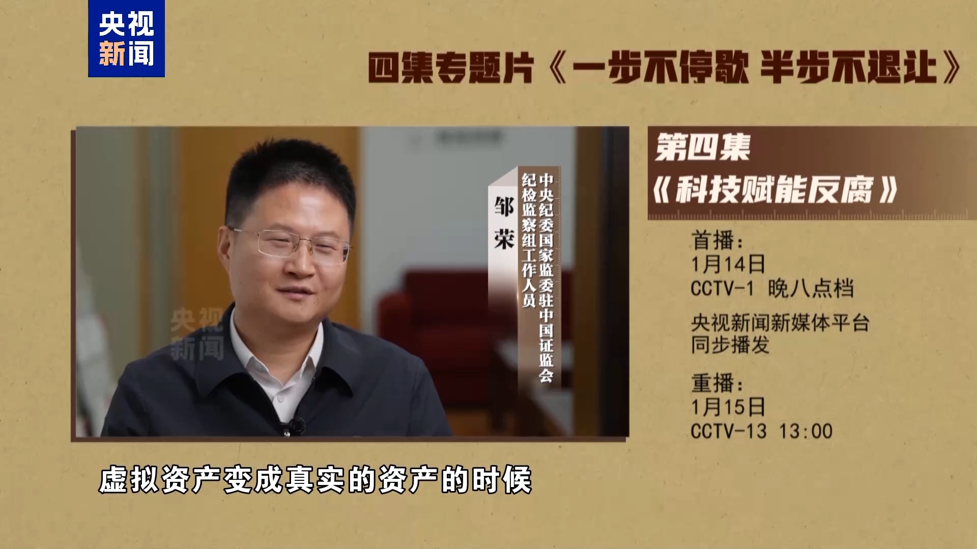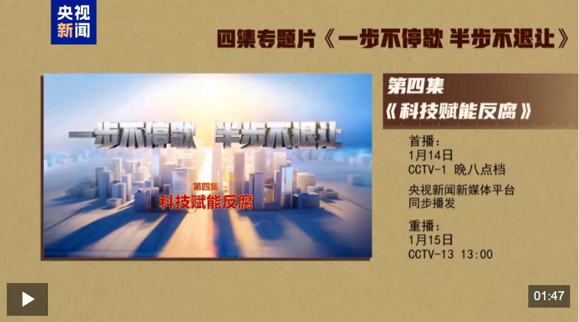 電視專題片《一步不停歇 半步不退讓》第四集《科技賦能反腐》,講述紀(jì)檢監(jiān)察機(jī)關(guān)豐富防治新型腐敗和隱性腐敗有效辦法,以信息化賦能正風(fēng)反腐,充分運(yùn)用科技手段精準(zhǔn)發(fā)現(xiàn)不正之風(fēng)和腐敗問題線索、迅速有效突破案件,著力提升智慧反腐、科技反腐水平。總臺(tái)央視綜合頻道1月14日晚8點(diǎn)檔播出,央視新聞新媒體平臺(tái)同步播發(fā)。