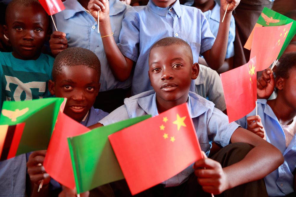 這是2019年6月13日,在贊比亞盧薩卡省瓊圭區(qū),手持中贊兩國國旗的兒童參加中國援非“萬村通”贊比亞項目竣工儀式。新華社記者 彭立軍 攝