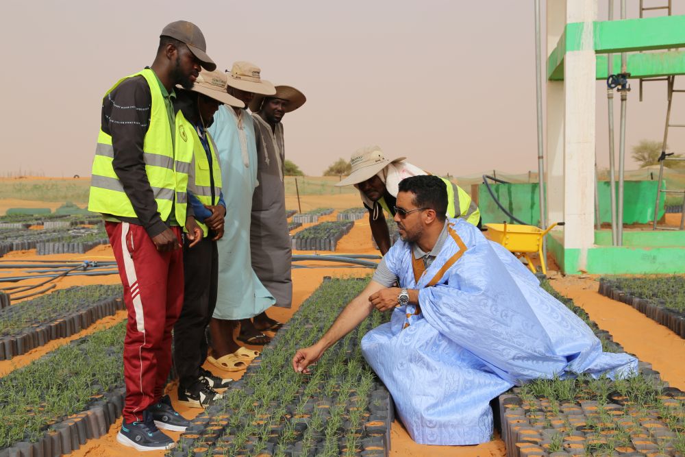 2025年5月22日,在毛里塔尼亞西部特拉扎區(qū)比爾·巴爾卡村,中非綠色技術(shù)公園毛里塔尼亞示范項目毛方協(xié)調(diào)員圖拉德·邁杜向工人傳授固沙植物種植技術(shù)。新華社記者 司源 攝