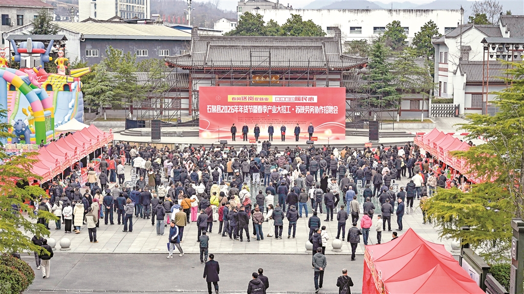 石泉縣2026年年貨節(jié)暨春季產(chǎn)業(yè)大招工·蘇陜勞務(wù)協(xié)作招聘會啟動儀式近日在秦巴風(fēng)情園舉行。本次活動創(chuàng)新融合“春風(fēng)行動”招聘會、年貨節(jié)與文旅促銷,吸引了縣內(nèi)外210余家重點企業(yè)參與,集中提供4500個優(yōu)質(zhì)崗位,旨在促進(jìn)就業(yè)與消費,助力縣域經(jīng)濟發(fā)展。(董長松 攝)