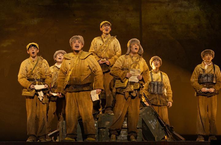 這是音樂(lè)劇《尋找李二狗》的演出劇照(2025年4月7日攝)。該劇以抗美援朝偉大歷史為背景,取材自志愿軍第39軍116師真實(shí)故事,通過(guò)當(dāng)代青年常衛(wèi)國(guó)借助爺爺?shù)幕貞涗洿┰交?950年鴨綠江畔的舞臺(tái)設(shè)定,展開兩代青年的跨時(shí)空對(duì)話。2025年11月,該劇榮獲第十八屆文華劇目獎(jiǎng)。