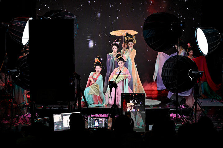 陜西省歌舞劇院的舞蹈演員在直播間進(jìn)行“團(tuán)播”表演(2025年12月25日攝)?!皥F(tuán)播”這一多人演藝直播新形式,正成為專業(yè)文藝院團(tuán)開辟線上“第二舞臺(tái)”、推動(dòng)傳統(tǒng)文化創(chuàng)新表達(dá)的新嘗試。“豎屏化”“快節(jié)奏”的改編,讓傳統(tǒng)劇目受到越來(lái)越多年輕人喜愛(ài)。數(shù)據(jù)顯示,陜西省歌舞劇院“團(tuán)播”單場(chǎng)最高曝光量超500萬(wàn),帶動(dòng)線下票房增長(zhǎng)約10%。