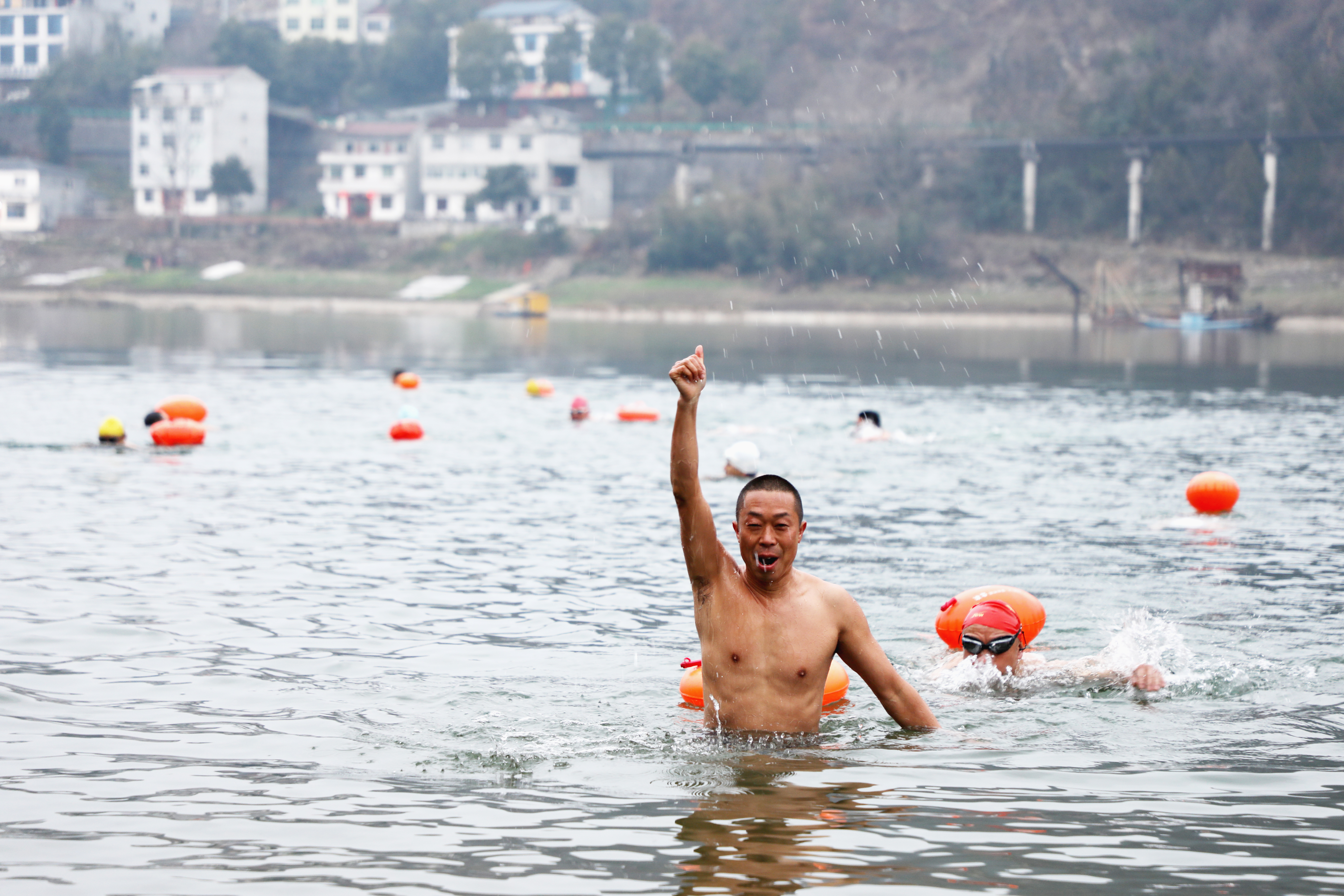 ⑩ 利用春節(jié)假期,冬泳愛好者暢游漢江。王 謐 攝