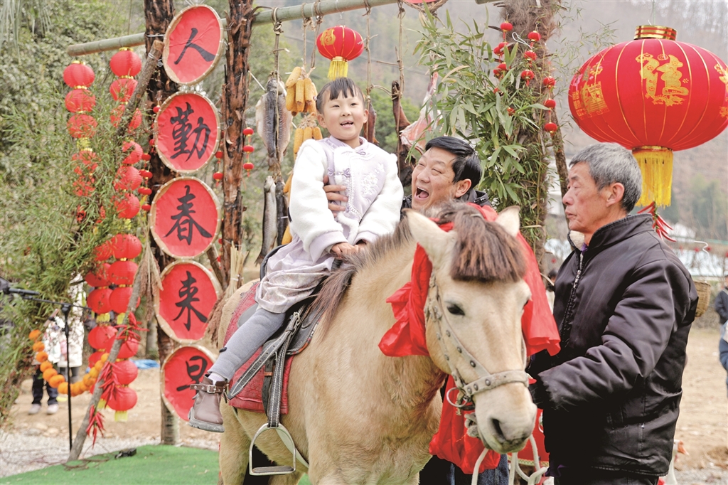 春節(jié)期間,寧陜縣城關(guān)鎮(zhèn)漁灣村舉行“回寧陜過(guò)大年”民俗展演。圖為游客體驗(yàn)?zāi)晁谆顒?dòng)。楊寧 攝