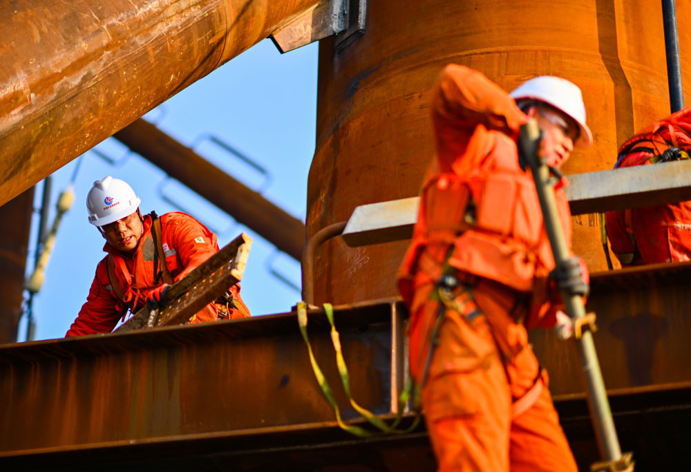 ??2026年2月13日,工人在位于渤海中部海域的渤中26-6油田開發(fā)項(xiàng)目(二期)作業(yè)現(xiàn)場施工。新華社記者 趙子碩 攝