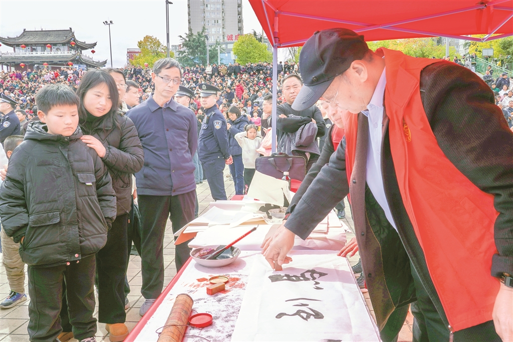 市集不僅有宣傳與服務,更有可看可學的文明實踐。活動通過宣傳展板集中展示漢濱區(qū)移風易俗成果與文明新風先進典型事跡,用身邊人、身邊事帶動群眾。非遺代表性傳承人現(xiàn)場詮釋勤儉美德,書法愛好者現(xiàn)場書寫福字與家訓,讓群眾在傳統(tǒng)文化熏陶中,潛移默化地接受新風教育?!胺沁z、書法和移風易俗結合得好,孩子也能受教育?!睅е⒆庸涫屑氖忻窭钆渴斋@滿滿、笑意盈盈。