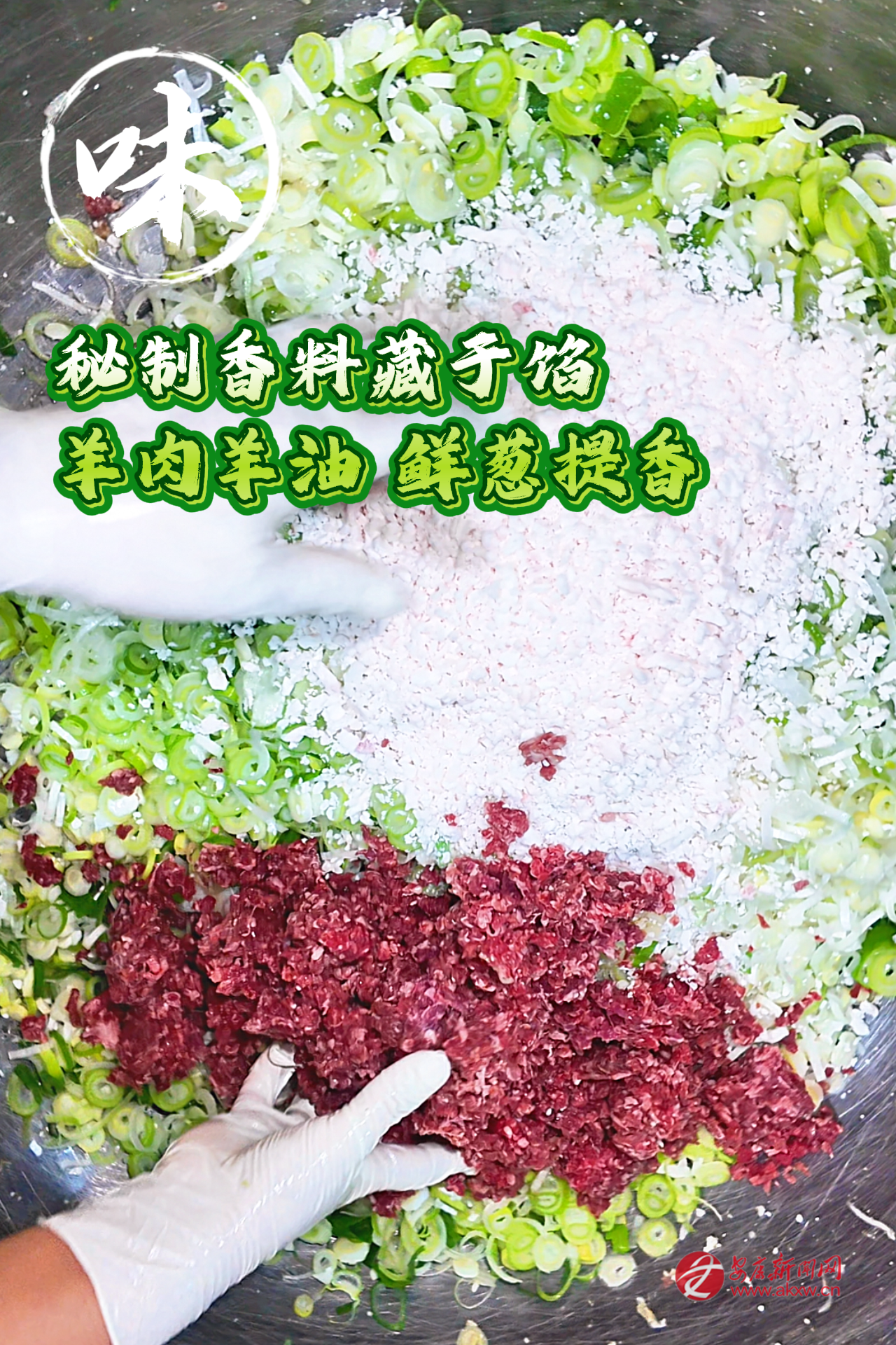 再是做油酥。抓一把面粉,擱碗里,加鹽、五香粉,用滾沸的熟油潑進(jìn)去,筷子急急地?cái)嚒D敲嬖谟屠飭陠甑仨?,漸漸融成濃稠的一團(tuán)。這油酥,是餅子起層的秘密。還有餡料。羊肉選用本地的羊,肉切成小小的丁。太肥了不行,須得瘦肉多一些,得加些羊脂丁,那樣煎出來才潤,才有汁水。蔥花要多,要本地的蔥,切得碎碎的,拌上鹽、花椒粉、五香粉。有的還加焙香的苜蓿末,黃黃的,有股子清野的氣味。