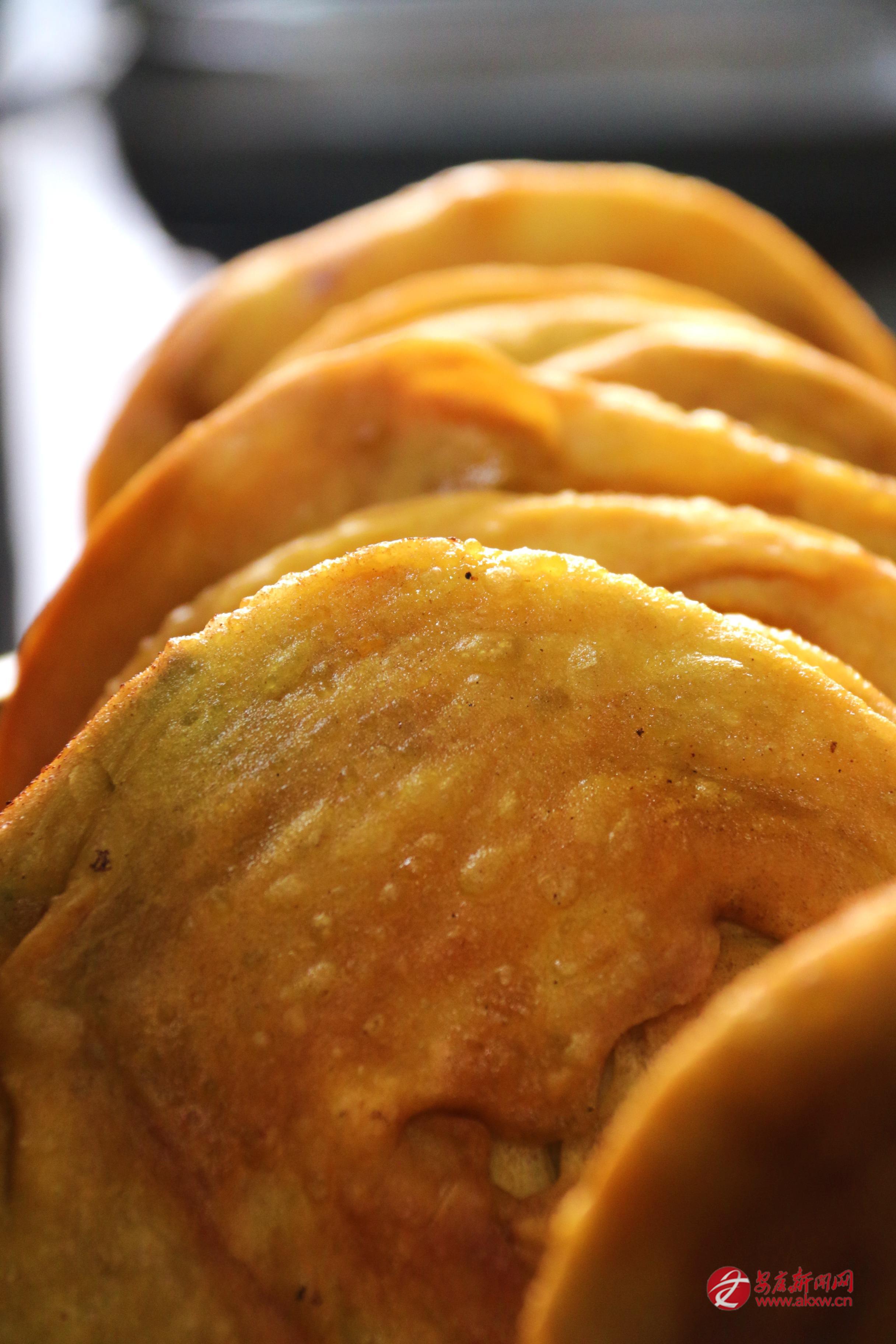 煎餅要用平底鍋,油要多,最好能沒過餅的一半。鍋燒熱了,放一點(diǎn)煉過的羊油,那油在鍋底滋滋地化開,香氣就起來了。餅放下去,小火慢煎,不住地翻面。眼看著,餅子慢慢鼓起來,皮兒漸漸金黃,有些地方焦黃了,有些地方還嫩著。起鍋的時(shí)候,整個(gè)餅子金黃黃的,油光光的,拿在手里燙得很。