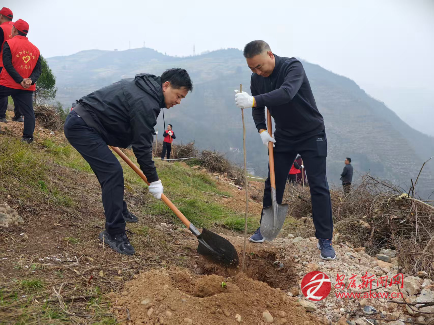 紅軍鎮(zhèn)組織機(jī)關(guān)干部、豐積社區(qū)黨員干部及群眾代表在李家院子開展義務(wù)植樹活動(dòng)