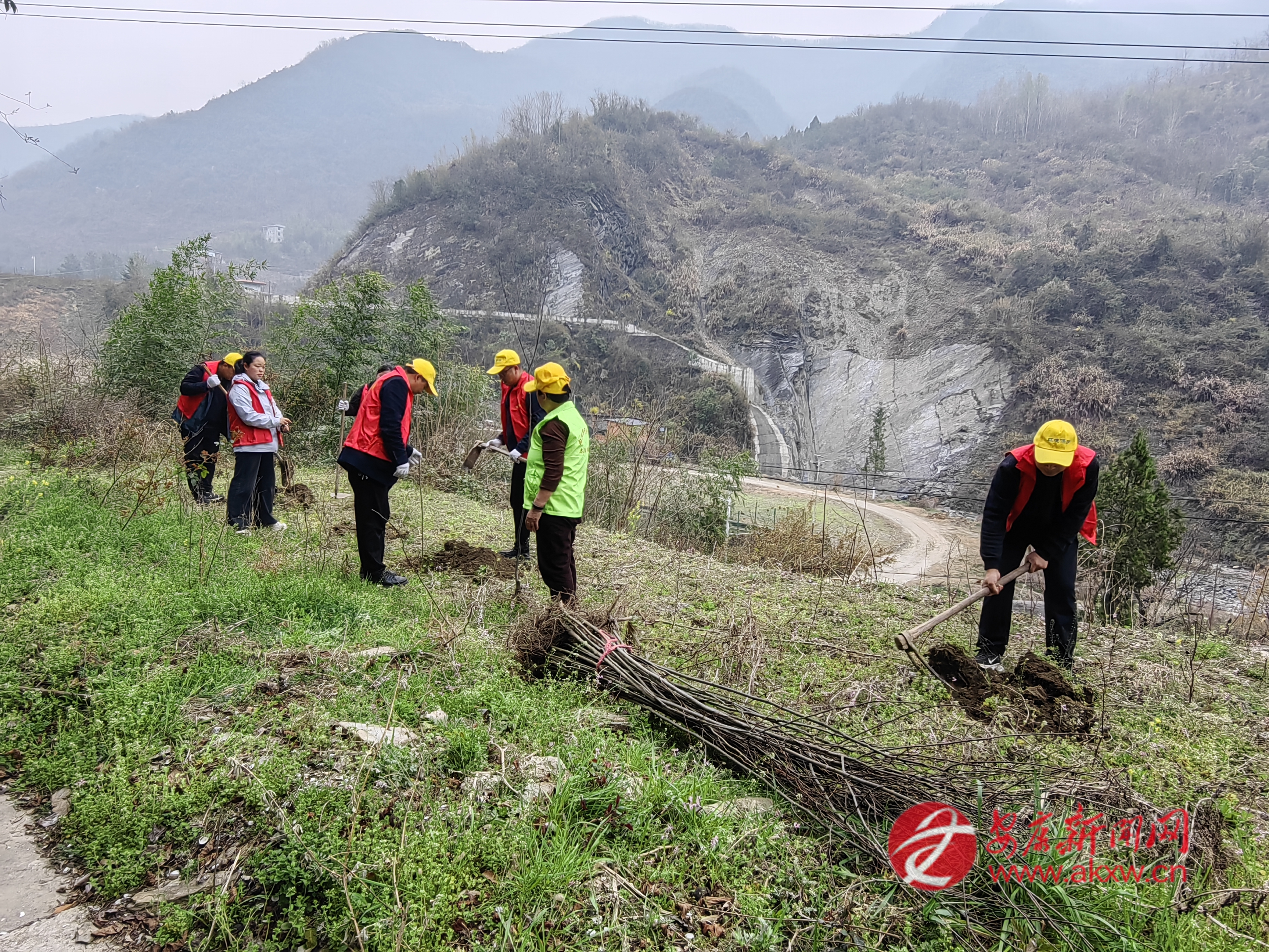 桐木鎮(zhèn)組織機(jī)關(guān)干部在青山村開展義務(wù)植樹活動(dòng)。