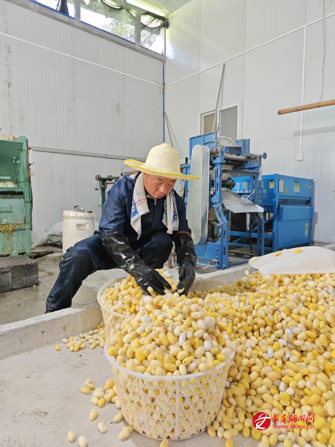 “以前養(yǎng)蠶全靠經(jīng)驗,溫濕度把控不好,蠶繭產(chǎn)量低。現(xiàn)在有了智能設備和技術指導,養(yǎng)蠶更輕松,收入也更高了?!崩罴液哟屦B(yǎng)蠶大戶王興義感慨道。作為產(chǎn)業(yè)帶頭人,他投資200余萬元成立家庭農(nóng)場,配套建設標準化養(yǎng)蠶室和加工廠房,引進滑輪升降式省力化蠶臺、自動化養(yǎng)蠶設備,實現(xiàn)了從種養(yǎng)到加工的全鏈條升級。