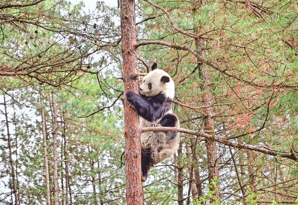 在樹上躲避天敵、等待母親歸來的大熊貓幼崽